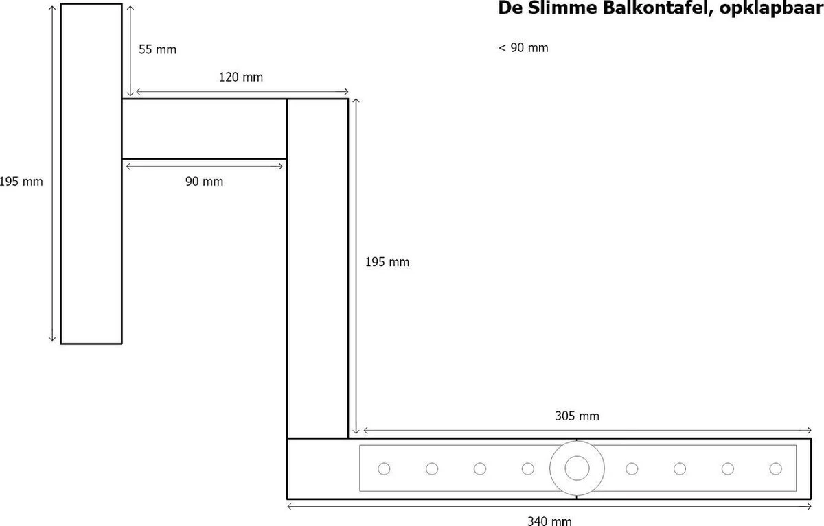 Heb jij een krap balkon? Dan is De Slimme Balkontafel iets voor jou! De houten tafel hangt aan de balkonreling en neemt daardoor nauwelijks ruimte in beslag. Dit model heeft een breed tafelblad met scharnier! Handig als je balkon écht smal is. Je kan bij het dineren of werken op de laptop het tafelblad eenvoudig uitklappen. Uitgeklapt is het blad 30 cm diep. De extra plank met scharnieren schroeven wij voor jou aan de tafel. Zo krijg je een kant-en-klare balkonbar met scharnier geleverd! De balkontafel hoef je alleen nog maar aan de balkonreling te bevestigen met bijgeleverd bevestigingsmateriaal.